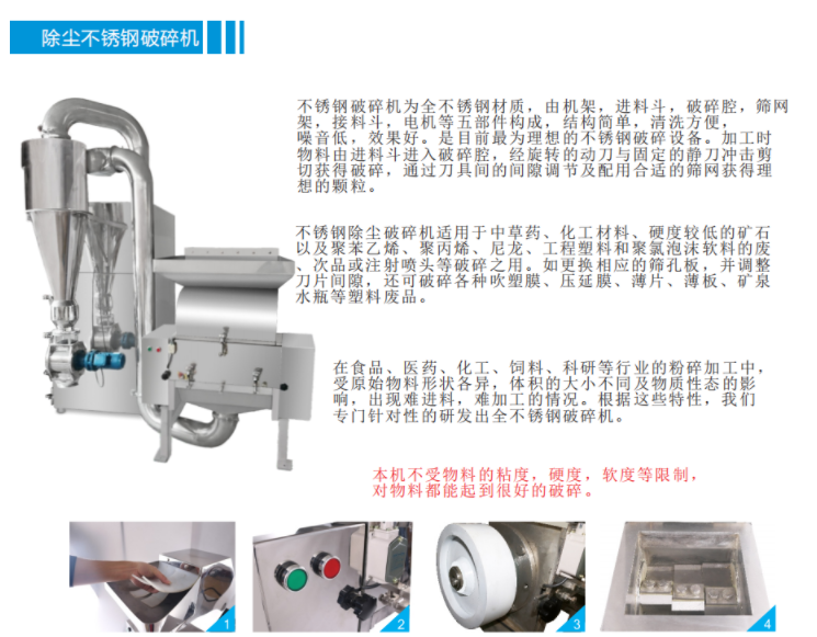 PE-180S系列除塵不銹鋼破碎機附帶除塵效果,結構簡單,清洗方便,噪音低,效果好。